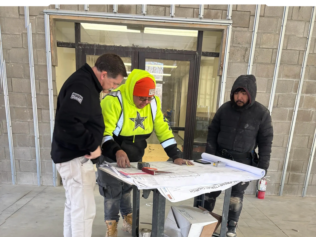 On-site planning is where a great finish starts. Here, the Sotos Drywall team is reviewing blueprints and measurements before work begins—making sure layouts, framing, and wall details are dialed in for a clean, accurate install. From commercial build-outs to residential projects, we take the time to coordinate, verify, and execute so every job stays on schedule and looks professional. rs!